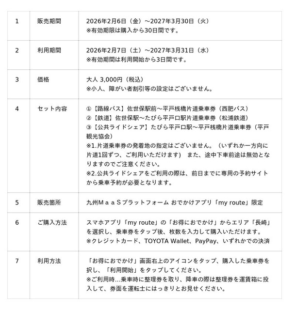 ●西肥バス・松浦鉄道・平戸観光協会が連携し、「佐世保と平戸・たびら平戸口」間を結ぶ路線バスおよび鉄道に「たびら平戸口~平戸桟橋」間の公共ライドシェアを組み合わせることで、佐世保から平戸間をシームレスにつなぐ初のデジタルチケットとなります。