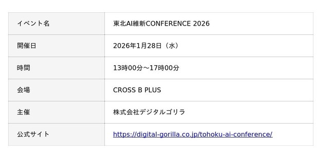 ソフトウェアを通して様々な情報サービス事業を展開する株式会社ジェイテック(以下「ジェイテック」)は、東北・仙台で開催される大規模AIイベント「東北AI維新CONFERENCE 2026」にゴールドスポンサーとして協賛することをお知らせいたします。