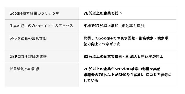 一方で、生成AI経由のアクセスは平均17%以上増加し、SNSやGoogleビジネスプロフィール(GBP)など複数接点の情報が整理されている企業ほど、検索・AI流入や申込率が向上する傾向も明らかになっています。本調査から、AI時代のマーケティングでは個別施策ではなく、情報の一貫性と全体設計が成果を左右することが示されました。