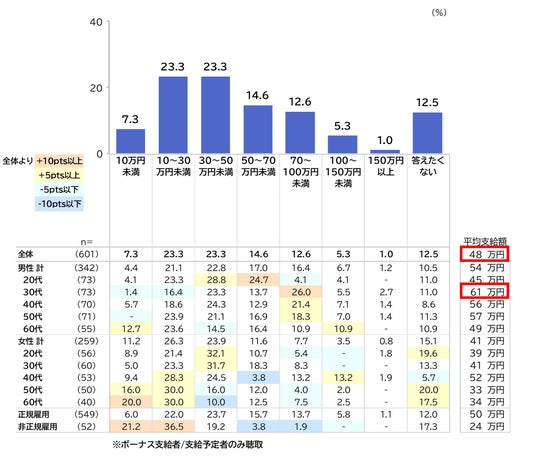 ボーナスの支給額は、全体平均で48万円となっており、最も平均支給額が高いのが男性30代の61万円でした。支給額の昨年との比較では、全体で60.1%がほぼ同じですが、昨年より増えた割合が減った割合よりも10pt高く、全体的には支給額が上がっている様子です。特に男女20代で昨年より増えたが全体よりも高くなっています。