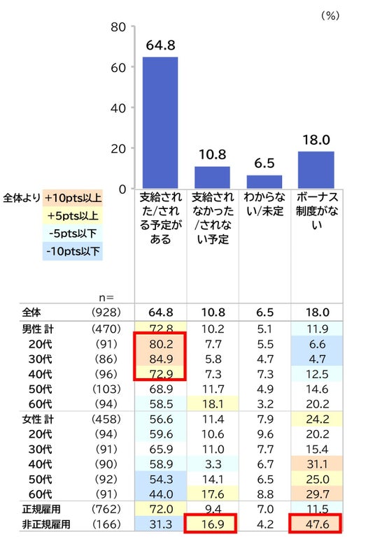1.ボーナス支給状況全体では、「支給された/される予定」が64.8%と多くの方に支給されています。特に男性20~40代で支給される割合が高くなっています。雇用形態別では、非正規雇用で「制度がない・支給されない」合わせて64.5%と、支給されない方が多い傾向です。