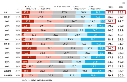 ボーナスの支給額に関する満足度に関して、全体では満足計が37.3%、不満足計が35.3%とほぼ変わらずでした。男女20代では、満足計が50%程度ありどの世代よりも満足度が高くなっています。