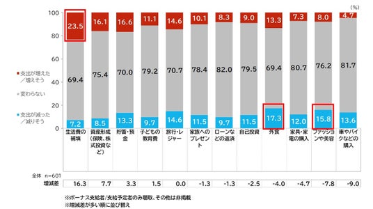 昨年よりボーナスの使い道として増えたのは「生活費の補填」で、23.5%と最も増えています。一方、支出が減ったのは「外食」(17.3%)と「ファッションや美容」(15.8%)でした。