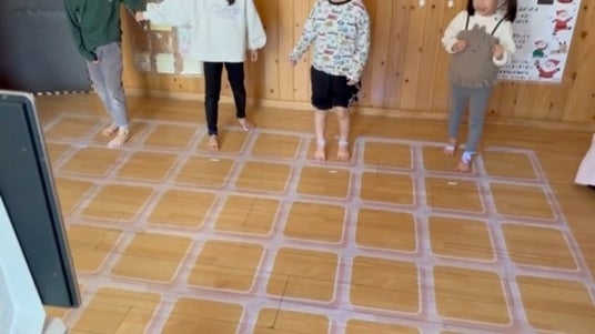 XRスポマル(SPOMARU)は、韓国のXR関連企業 IMが提供する、床面へのAR投影を活用した屋内型AR運動プラットフォームです。プロジェクター・センサー・PCを一体化したシステムにより、床に投影される映像に合わせて「踏む」「跳ぶ」「避ける」「追いかける」といった直感的な身体動作を促します。