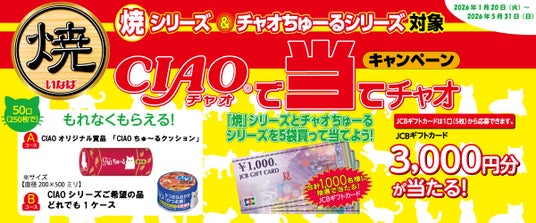いなばペットフード(いなば食品グループ 本社:静岡県静岡市清水区由比、会長:稲葉優子)は2026年1月20日(火)より、国内外で多くの猫ちゃんに愛されている「CIAOちゅ~る」シリーズおよび「焼」シリーズを対象に、日頃のご愛顧に感謝を込めた「CIAOで当てチャオ」キャンペーンを開始いたします。