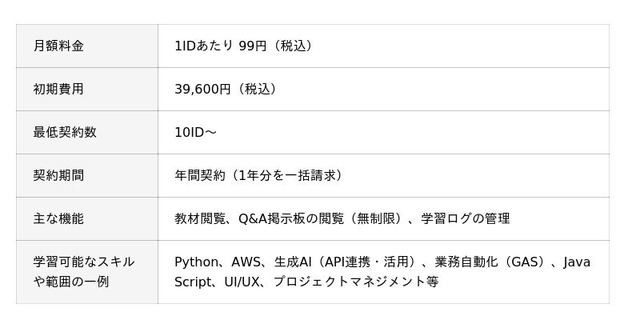 1IDあたり月額99円という圧倒的な低コストを実現し、全社員への学習環境構築のハードルを極限まで下げました。