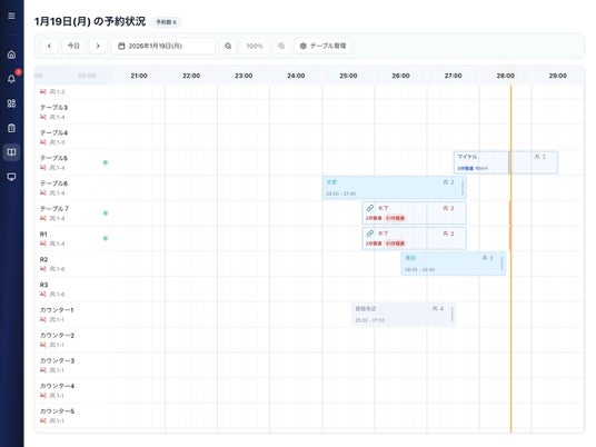 大手グルメサイトの予約を一元管理し、双方向に新規予約・予約変更・予約キャンセルの情報が瞬時に同期できる予約台帳機能も搭載。