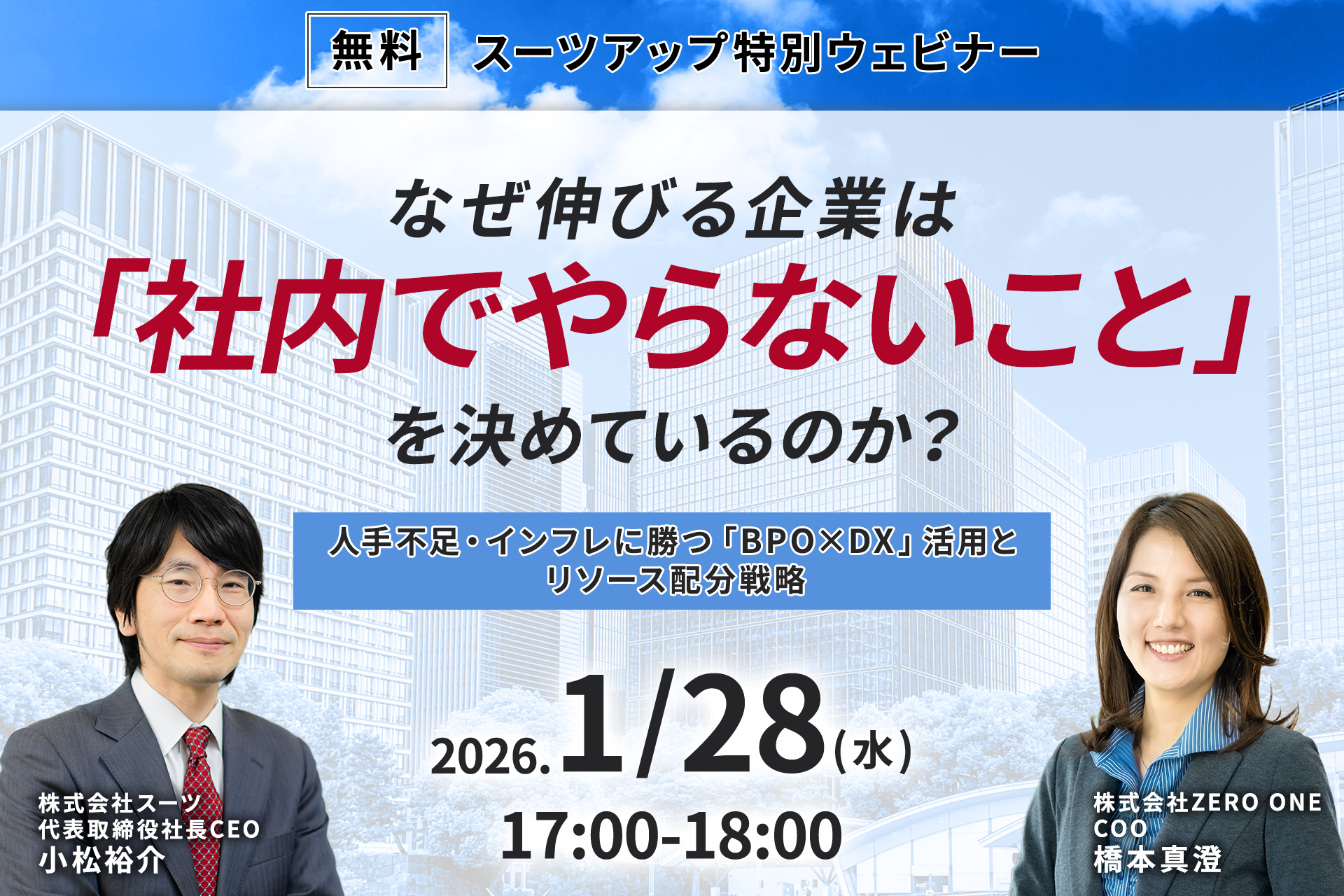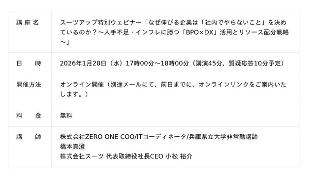 株式会社スーツ(所在地:東京都千代田区、代表取締役社長CEO:小松 裕介)は、2026年1月28日(水)17時から、ゲスト講師に、株式会社ZERO ONE COO 橋本真澄氏を迎え、第22回となるスーツアップ特別ウェビナー「なぜ伸びる企業は「社内でやらないこと」を決めているのか?~人手不足・インフレに勝つ「BPO×DX」活用とリソース配分戦略~」を無料開催します。