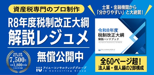 相続・事業承継に特化し、年間約1,800件(累計7,500件以上)の支援実績を持つアイユーコンサルティンググループ(本社:東京都豊島区/代表:岩永 悠、共同代表:出川 裕基 以下当グループ)は、1月21日より「令和8年度税制改正大綱解説レジュメ」(60P超)を無償公開いたします。