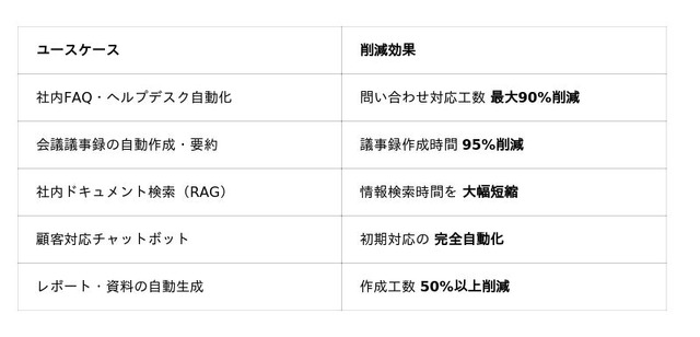 - 株式会社サイバーエージェント:社内FAQの自動化により、月間約3,000時間の業務工数を削減。