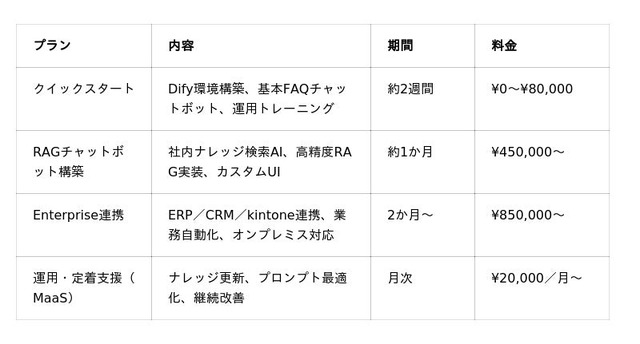 本サービス正式リリースを記念して、2026年2月末までにお申し込みいただいた企業様限定で:- Dify導入コンサルティング(通常30分)を90分に拡大して提供