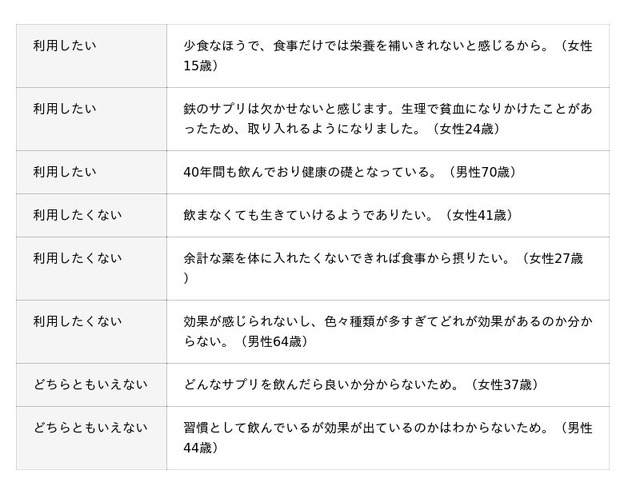サプリメントの利用状況や意向などについて聞いています。調査結果をお知らせいたします。