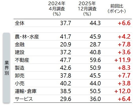 業界別にみると、「マイナス影響の方が大きい」では、『不動産』が前回比11.9ポイント増の59.6%でトップとなった。住宅ローン金利の上昇や投資用不動産の利回り悪化により需要の減退が懸念されるほか、市況の冷え込みによる不動産価格の下落圧力が生じる可能性もある。次いで、『製造』(50.9%、同8.3ポイント増)、『運輸・倉庫』(50.5%、同12.0ポイント増)が5割台で続いた。『その他』を除く全9業界で前回調査から上昇し、『運輸・倉庫』は最も大きい上昇幅だった。