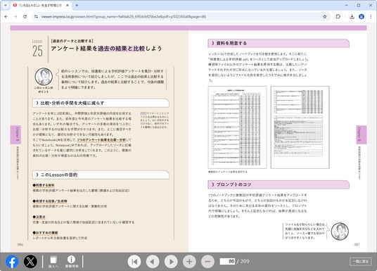 書籍内容の提供には、自社開発の「インプレスWebブックビューアー」を使用します。Webブラウザーで紙面を閲覧できるので、場所や時間を選ばずにPCやスマートフォンなどから登録不要で利用できます。また、SNSで書籍の情報を共有したり、書籍の購入や詳細を確認したりできる機能も備えています。