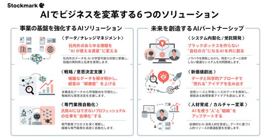 本提携により、ストックマーク社の高度なAI技術やデータ構造化ソリューションと、当社が持つ熟練者の思考プロセスを可視化するソリューションを融合。属人化されたナレッジを組織の資産へと変換し、事業企画、R&D、マーケティング、セールスの各部門の連携を強化するAI環境を提供します。1. 技術マーケティング戦略の策定・業務変革コンサルティング