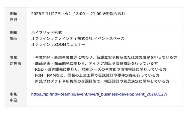 エンジニアプラットフォームを提供するファインディ株式会社(東京都品川区、代表取締役:山田 裕一朗、以下「当社」)は、2026年1月27日(火)に登壇イベント「事業は、偶然では育たない──AI時代に再考すべき仮説・検証のアプローチ」をハイブリッド形式で開催することを発表します。