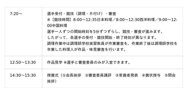 ・競技ルール:調理技術や衛生管理、出来栄え、味などについて審査し、その合計得点を競う。