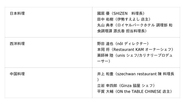 調理師学校を卒業後、活躍している料理人(9名、下表):作品・味見審査