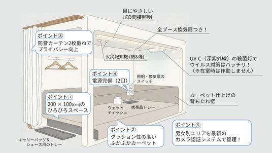 本サービスは、ジャンボフェリーをご利用されるお客様向けに、高松東港内の休憩ブース「ちょっとこま」で快適にお休みいただける環境を提供するものです。乗船前後の時間を休憩時間として有効に活用できるため、移動時の疲労を軽減することができ、フェリー利用の利便性向上につながります。