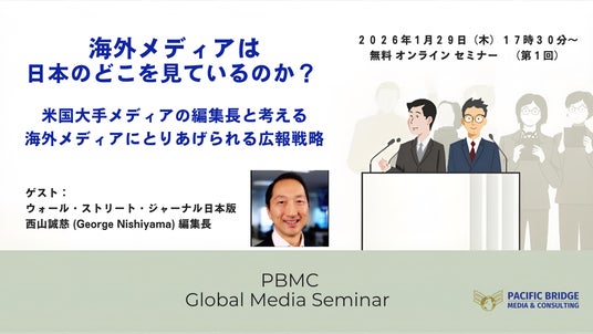 Pacific Bridge Media and Consulting, Inc.(以下、PBMC、本社:東京都)は、毎回世界のメディアやニュース機関の第一線で活躍する専門家をお招きし、海外メディアの特性を理解しながらグローバルメディアと企業PR関係者との接点を探る無料のオンラインメディアセミナー(第一回)を1月29日に開催します。