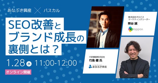 SEOツール「パスカル」の開発・提供を行う株式会社オロパスは、2026年1月28日(水)に、SEO対策によって集客成果とブランド成長を実現した穴吹興産株式会社様をお招きし、「SEO改善とブランド成長の裏側とは?」をテーマにウェビナーを開催いたします。