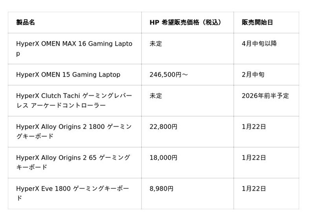 また、16インチ型ゲーミングノートPC「HyperX OMEN MAX 16 Gaming Laptop」、15.3インチ型「HyperX OMEN 15 Gaming Laptop」、HP初のXbox認定アーケードコントローラー「HyperX Clutch Tachi ゲーミングレバーレス アーケードコントローラー」、用途やプレイスタイルに応じてカスタマイズ可能なゲーミングキーボード3種を発表します。