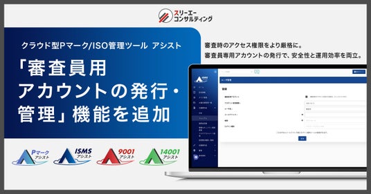 Pマーク、 ISOコンサルにおける支援実績 No.1(注1)のPマーク/ISOの取得・運用支援サービス「認証パートナー」を提供する株式会社スリーエーコンサルティング(本社:大阪府大阪市、代表取締役社長:竹嶋 寛人)は、このたび、当社が提供するクラウド型Pマーク/ISO管理ツール『Pマークアシスト』『ISMSアシスト』『9001アシスト』『14001アシスト』において、審査時の情報セキュリティ強化を目的とした「審査員用アカウント発行機能」を新たに追加しました。