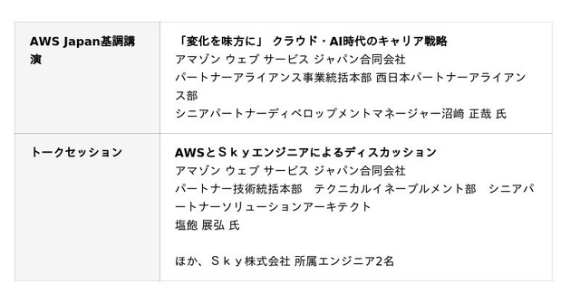 本ウェビナーはオンラインで開催。AIが急速な発展を見せている今、エンジニアはどのようなキャリア戦略を描くべきなのか。AWS Japanによる基調講演と、同社とSky株式会社のエンジニアによるディスカッションを通して、これからのエンジニアに求められるスキルと目指すべきキャリアパスを考えます。