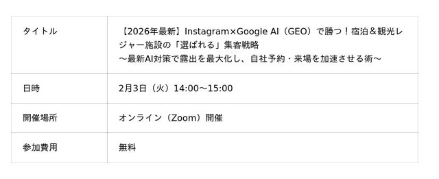 株式会社ロカオプ(本社:東京都新宿区新宿 代表取締役:縣将貴、以下:ロカオプ)は、2月3日(火)14:00より無料のオンラインセミナー『【2026年最新】Instagram×Google AI(GEO)で勝つ!宿泊&観光レジャー施設の「選ばれる」集客戦略 ~最新AI対策で露出を最大化し、自社予約・来場を加速させる術~』を開催いたします。