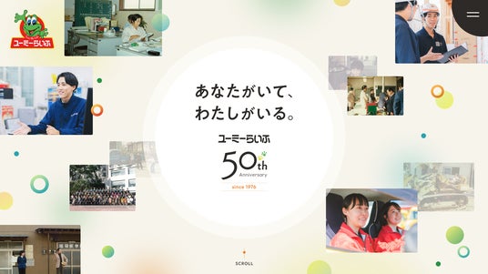 グループカラーの黄色をベースにしつつ、可愛すぎず、信頼感のある「ユーミーらしさ」を色合いで表現しました。50周年特設ページは、これまでの歴史をじっくりと振り返るイメージで、落ち着いたトーンを採用しました。