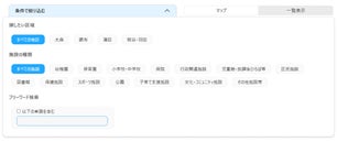 子育て関連の施設情報をマップと一覧で表示。「地域」「施設の種類」で絞り込み検索が可能。