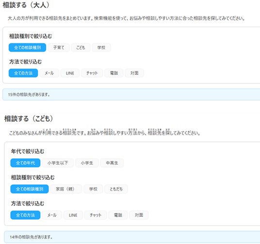 ◆大人とこどもの相談機能「相談する」機能では、「大人」と「こども」の入り口を分けることで、利用者が自分の立場に合った相談先に迷わずたどり着けるようにしました。さらに、相談内容や相談方法で絞り込める検索機能を備え、悩みや状況に応じて相談窓口を選びやすくしています。