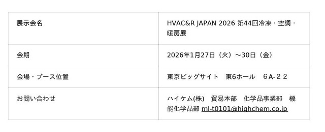 グローバルに事業を展開する化学品商社兼メーカーのハイケム株式会社(本社:東京都港区 代表取締役社長:高 裕一(たか ゆういち)、以下ハイケム)は、2026年1月27日(火)から30日(金)まで東京ビッグサイトで開催される「HVAC&R JAPAN 2026 第44回冷凍・空調・暖房展」に出展いたします。日中ファインケミカル貿易のリーディングカンパニーだからできる、環境規制に対応したHFO(ハイドロフルオロオレフィン)、HFC(ハイドロフルオロカーボン)をはじめとするフッ素系冷媒の幅広い製品ラインナップをご紹介します。