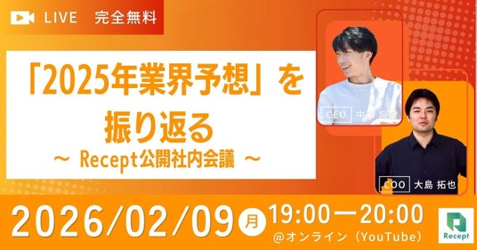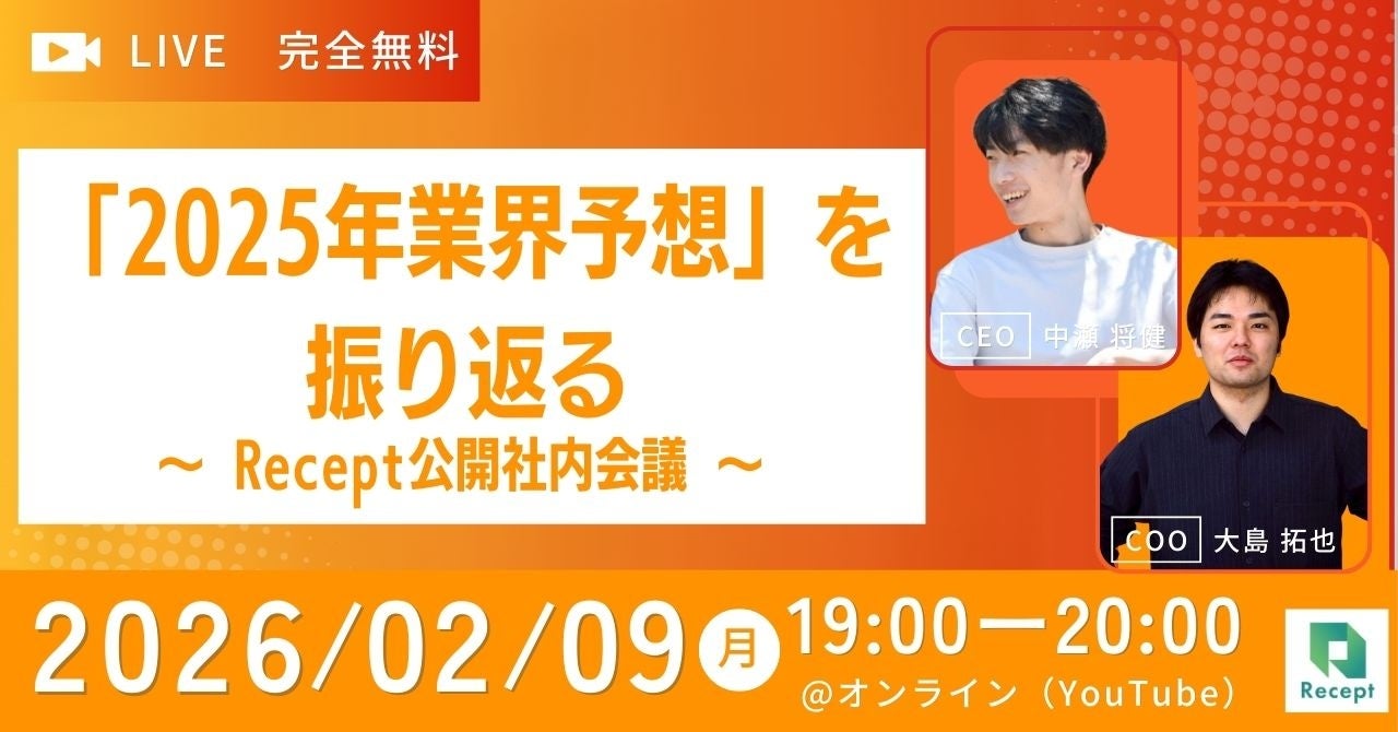 株式会社Recept(本社:東京都千代田区、代表取締役CEO:中瀬 将健)は、2026年2月9日(月)19:00より、オンラインウェビナー「DID/VCウェビナー『2025年業界予想』を振り返る ~ Recept公開社内会議 ~」を無料開催いたします。