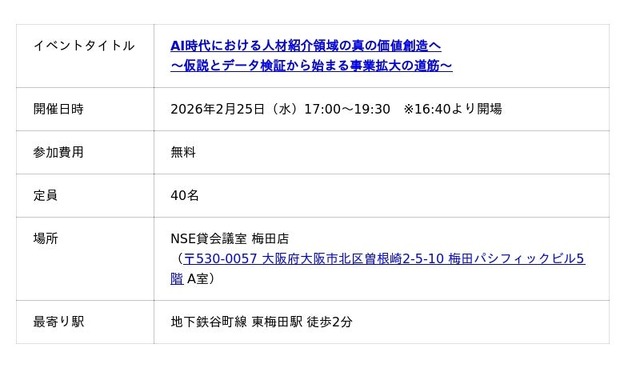 人材ビジネス向けマッチングシステムを提供するポーターズ株式会社(東京証券取引所グロース.証券コード5126、東京都港区、代表 西森 康二)は、「AI時代における人材紹介領域の真の価値創造へ ~仮説とデータ検証から始まる事業拡大の道筋~ 」と題した無料オフラインイベントを2026年2月25日(水)17:00~大阪で開催します。