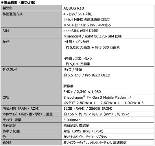 そのほか、5,000mAhの大容量バッテリー搭載、防水(IPX5・IPX8)・防塵(IP6X)(注11)、指紋・顔による生体認証、おサイフケータイ(R)、ハイレゾオーディオ、nanoSIMとeSIMのデュアルSIMにも対応するなど、日常生活の様々なシーンにて快適にご利用いただけます。