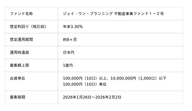 「未来をわかちあう投資」を提供する「Funvest(ファンベスト)」(以下、Funvest)は、「ジェイ・ワン・プランニング 不動産事業ファンド1-2号」(以下、本ファンド)の募集を1/26より開始しますので、お知らせいたします。