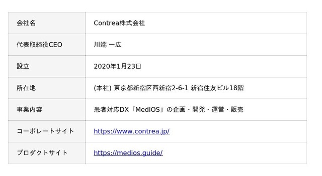 患者対応DXプラットフォーム「MediOS (以下、メディオス) 」を医療機関向けに提供するContrea株式会社 (本社:東京都新宿区、代表取締役:川端一広、以下「コントレア」) は、シリーズAラウンドにおいて伊藤忠テクノロジーベンチャーズをリード投資家として、既存株主、新規投資家を引受先とした第三者割当増資に加え、金融機関からの融資により総額9.5億円の資金調達を実施したことをお知らせいたします。