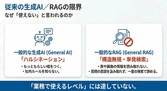 また、従来の生成AIやRAG(検索拡張生成)では、文書構造を正しく理解できず、根拠が不明確な回答となるため、現場で信頼されず定着しないケースが多く見られます。