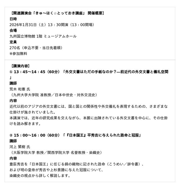 特集展示「豊臣秀吉とアジアの外交」の開催にあわせ、展示資料をより深く読み解くための関連講演会を開催します。