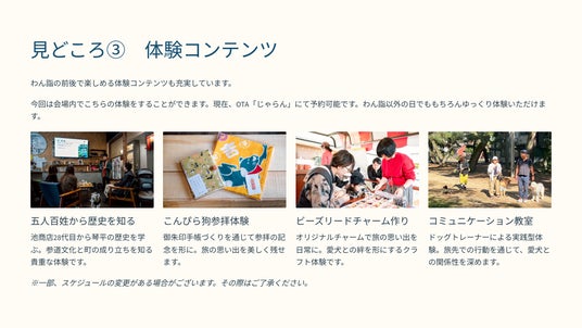 わん詣の前後で楽しめる体験コンテンツも充実しています。今回は会場内でこちらの体験をすることができます。一部、スケジュールの変更があります。その際はご了承ください。