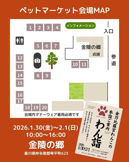 ・わん詣マーケット会場は「金陵の郷」各種受付・台紙・マップの配布はコチラです