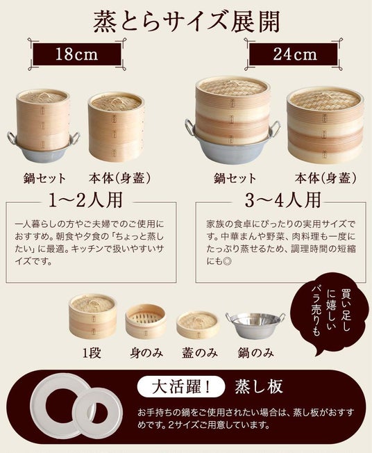 サイズは一人暮らしやご夫婦に最適な18cmと、家族用にぴったりな24cmの2種類をご用意。それぞれ単品購入のほか、蓋・身・鍋・蒸し板などを個別に買い足せるバラ売りも対応しています。専用鍋は燕三条のステンレス製で、段付き構造により蒸篭がぴったりフィットし、蒸気を無駄なく活用。鍋料理にも活躍します。