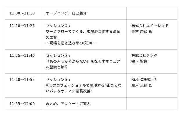 DX推進担当者・情報システム部門・現場改善リーダーを対象に、現場主導のノーコード開発による持続可能なDX推進 を中心にした講演・デモンストレーション・質疑応答を実施する60分のオンラインイベントです。参加者は、「やらされ感」を脱却し、現場発の改善活動を継続させる仕組みとノウハウ を通じて、業務改善や全社展開のヒントを得ることができます。