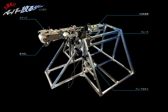 脚立でありながらもがむしゃらに走る姿はまさに爆走するモンスター。キャタツーリングを生で見るとテレビとは違う大迫力の走りを見せてくれます。飛び跳ねるほどの世界一のパワフル脚立をぜひ間近でご覧頂くと共に、トイレットペーパーの飛行機雲(コントレイル)のように飛んでいく美しい姿は一番の見どころ。計算されたセッティングから絶妙なタイミングで動いていくハラハラ感と発射する瞬間の迫力とあわせてご覧下さい!
