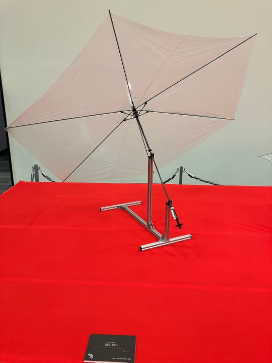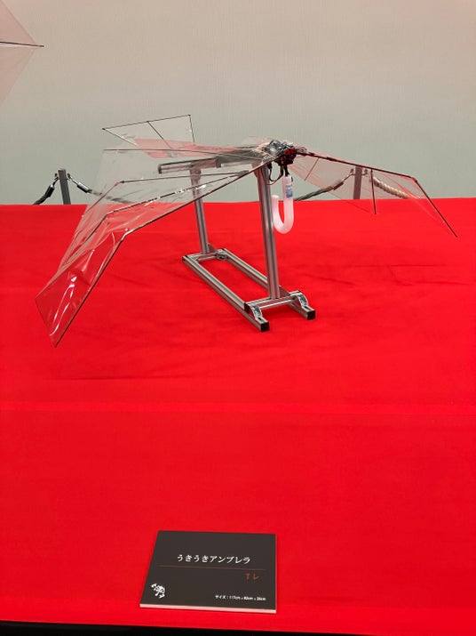 Tレが開発した3体のモンスター。恐竜ちゃん缶蹴りの「ユウカンザウルス」は、“優しく蹴る”をコンセプトに、炭素繊維、金属、木材等の素材の複合化で実現。ビニール傘滞空マッチの「開く君へ」は“極限の軽さを追及”し、骨組みからビニール全ての素材を1g単位で追い込んだ。一方「うきうきアンブレラ」は動的な羽ばたきを採用し、まさに“鳥が飛ぶ”が如く空を翔ける。素材の知識を十二分に注いだモンスター達をご覧下さい。 ※Tレはモンスター展示のみとなります。