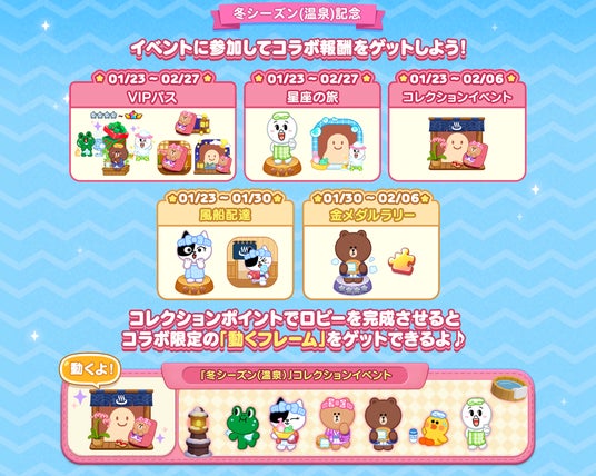 プレイを助けてくれるミニモンに温泉をテーマにした「温泉ブラウン」「温泉ムーン」「温泉レナード」などの仲間たちが期間限定で登場します。これらのミニモンは、今回の冬シーズンイベントにあわせて登場する新たなラインアップです。限定ミニモンはガチャから獲得できるほか、イベントでも入手可能です。【期間】2026年1月23日(金)11:00 ~ 2月6日(金)10:59