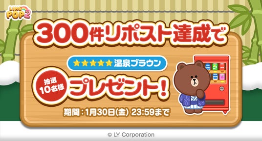イベント期間中、「LINE POP2」公式X(旧Twitter)アカウントをフォローし、該当のポストをリポストすると、抽選で限定ミニモン「★5 温泉ブラウン」が当たるキャンペーンを開催します。【賞品】「★5 温泉ブラウン」:10名様