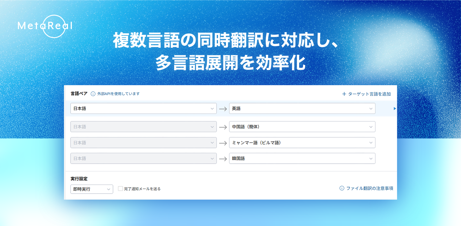 これにより、同一文書を複数言語へ一括で翻訳することが可能となり、多言語翻訳にかかる作業時間を大幅に削減します。