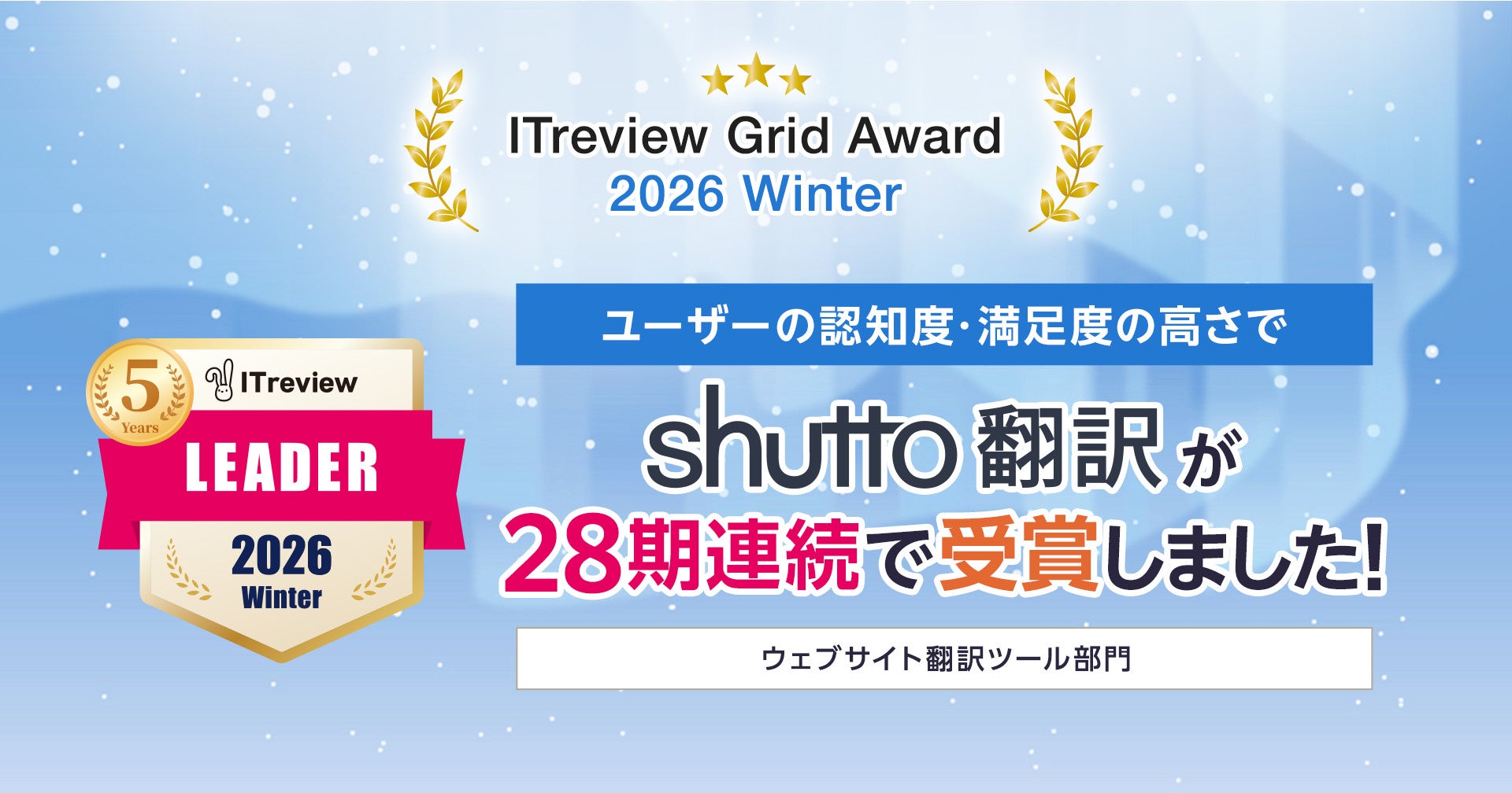 ”おもてなしを科学する”株式会社イー・エージェンシー(本社:東京都千代田区、代表取締役:甲斐真樹、以下イー・エージェンシー)が提供するプロダクトブランド『さぶみっと!』のひとつ、ウェブサイト翻訳ツール『shutto翻訳(しゅっと ほんやく)』は、2026年1月21日に発表されましたアイティクラウド社主催の「ITreview Grid Award 2026 Winter」において、ユーザーから高い評価を受け、ウェブサイト翻訳ツールカテゴリーで28期連続で「Leader」を受賞しました。